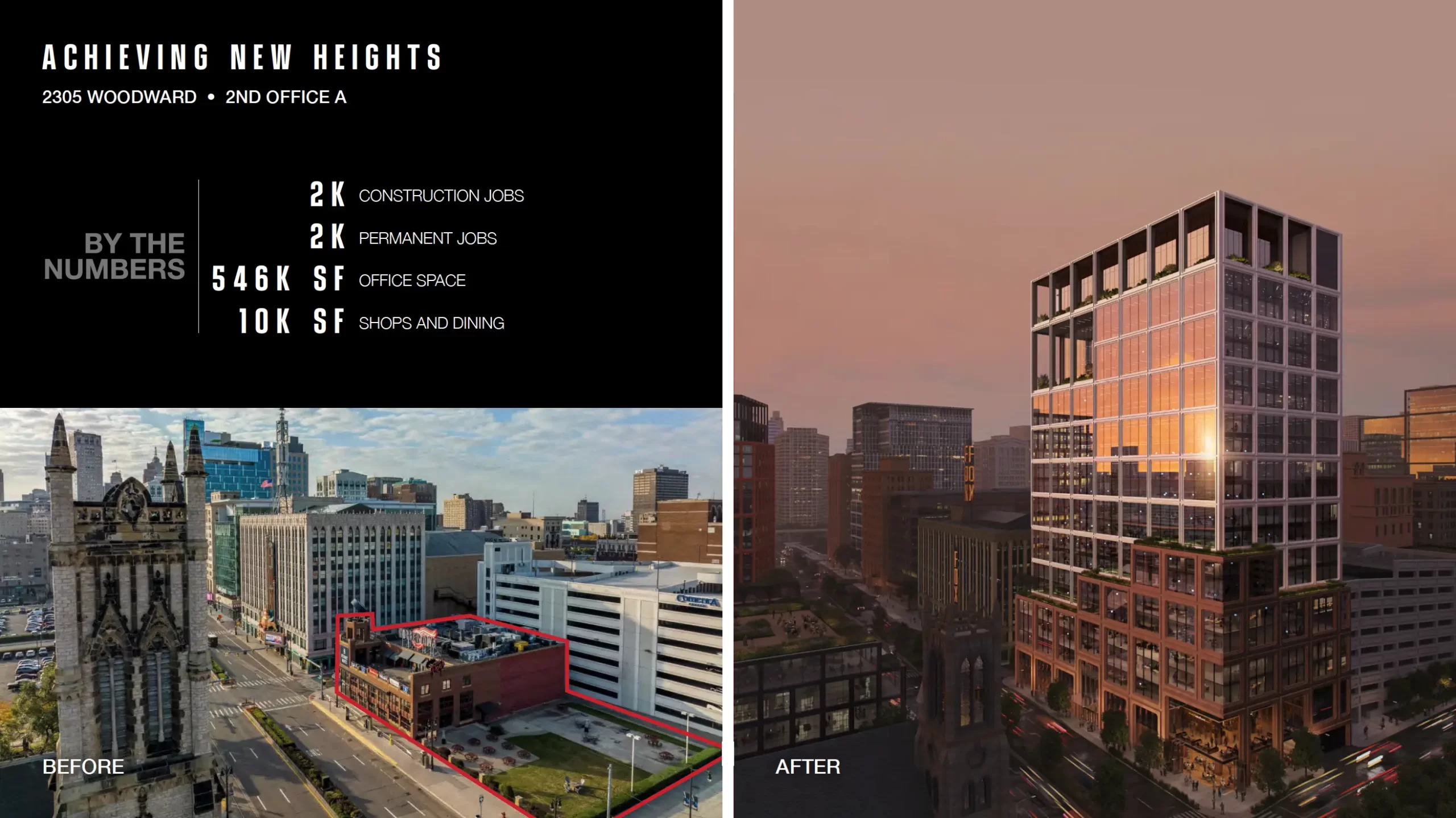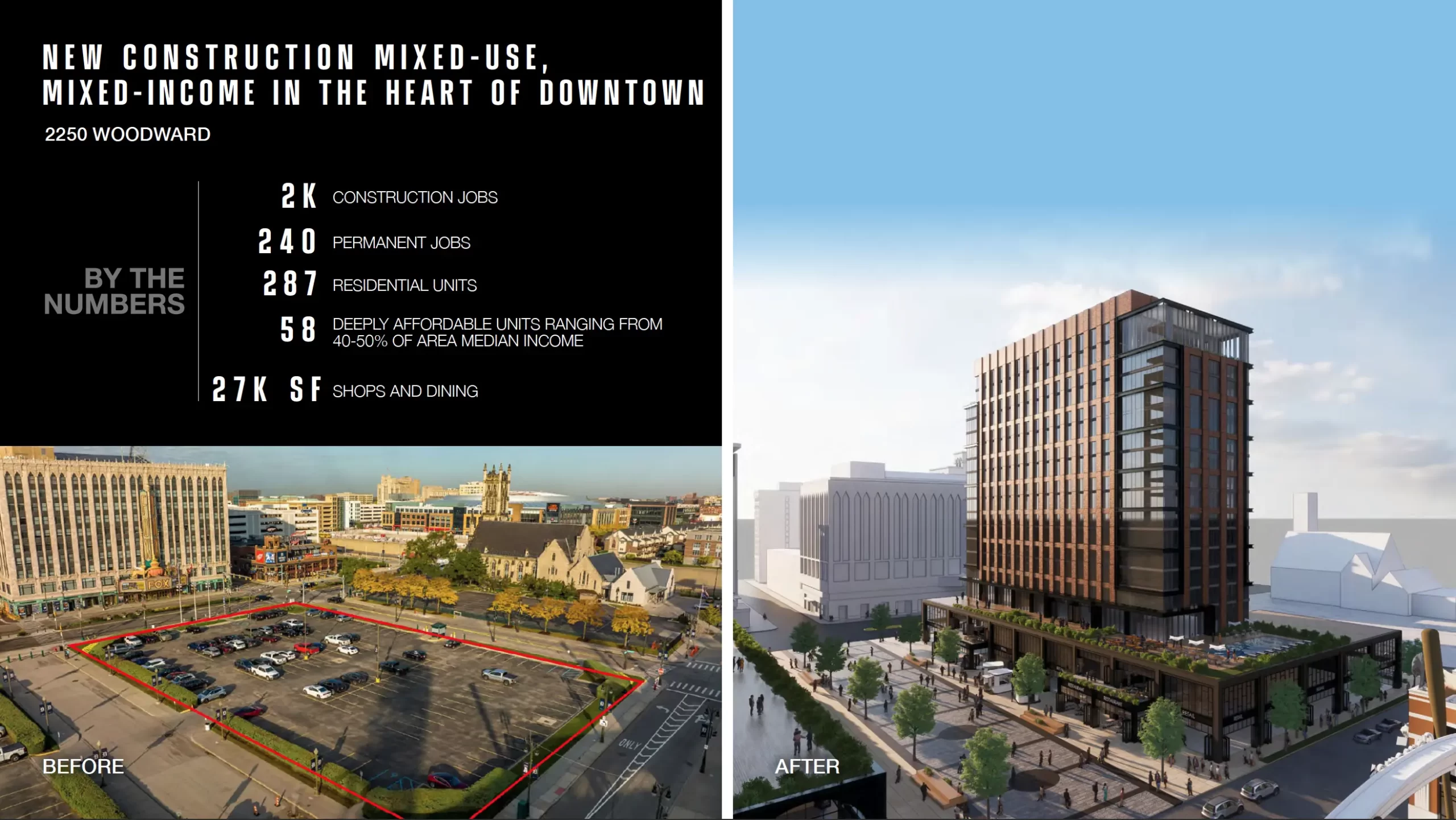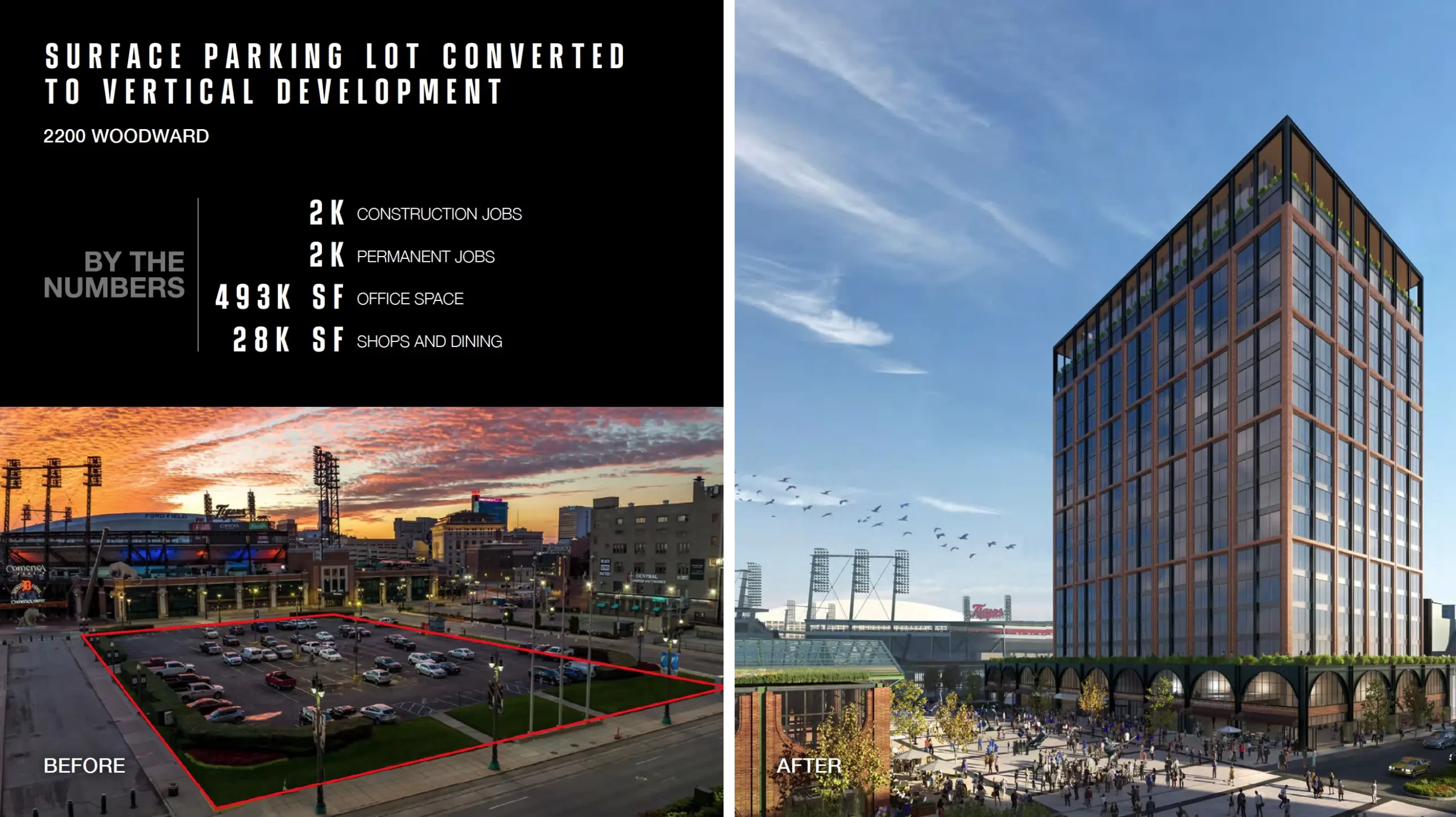 Un espacio ahora utilizado como estacionamiento justo entre el estadio de los Tigres de Detroit y el Teatro Fox, se convertirá en un edificio de uso mixto para departamentos y una plaza comercial en la primera planta.