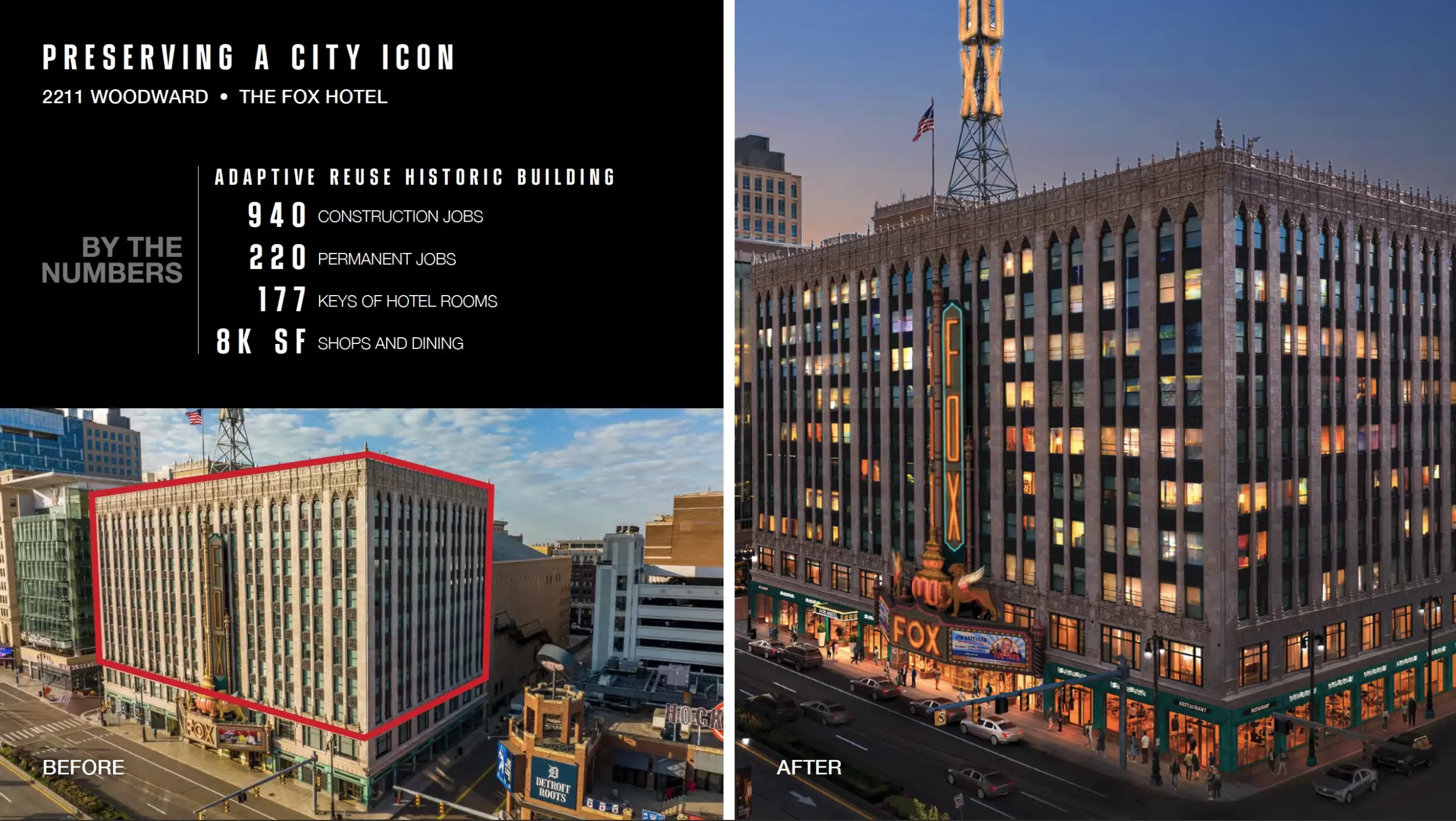 El emblemático teatro Fox mantendrá su esencia, realizando actualizaciones necesarias para los eventos actuales, pero los espacios que actualmente se encuentran vacíos, se convertirán en un hotel de lujo en el corazón de la ciudad.