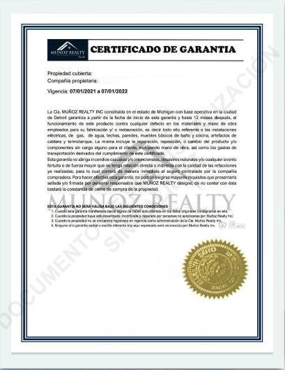 Al invertir en una propiedad con Muñoz Realty, recibe un documento con la validez de su garantía que cubre un periodo de 12 meses a partir de la fecha de compra.