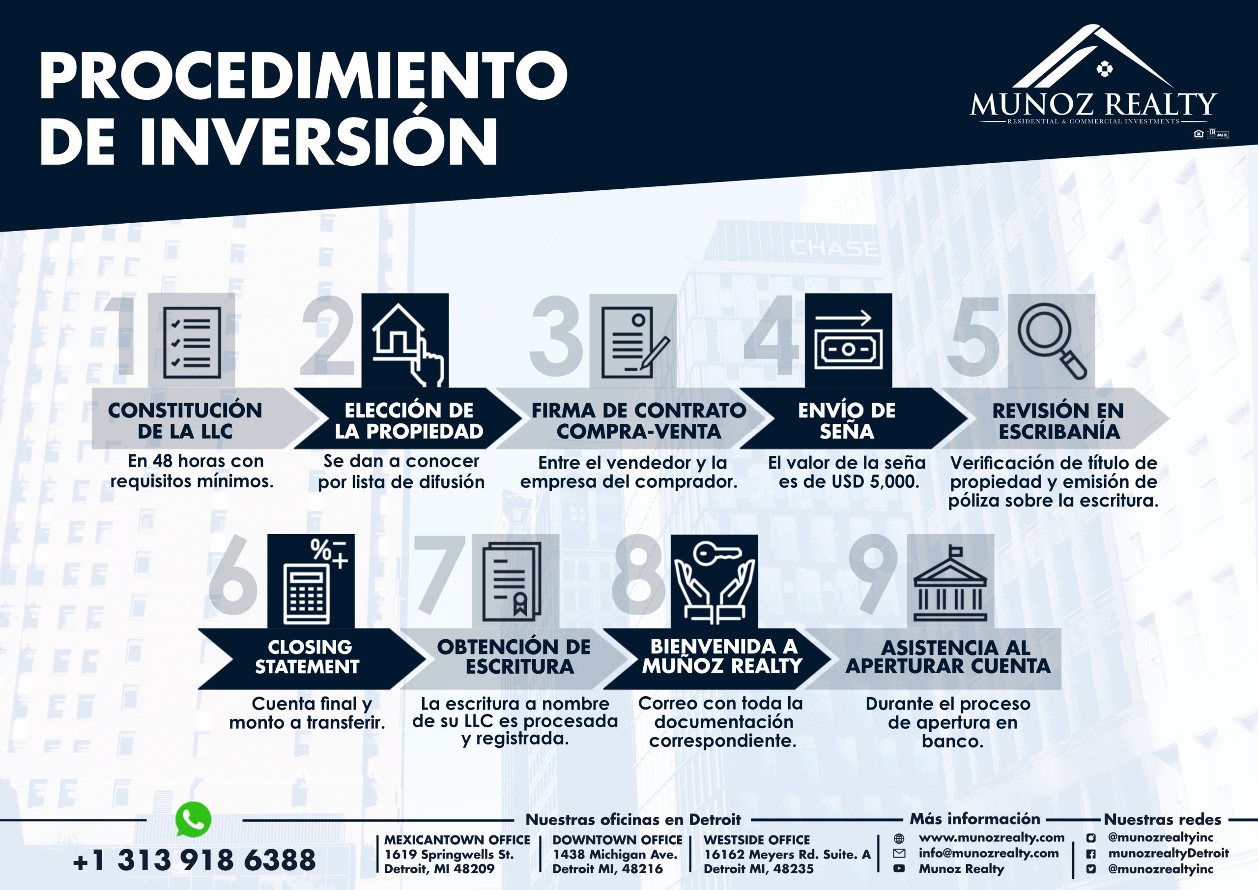 Invertir con Muñoz Realty es sinónimo de tranquilidad, contamos con más de 20 años viviendo y trabajando en la ciudad de Detroit, más de 200 empleados que trabajan para ofrecer las mejores propiedades y 3 oficinas para atender a nuestros clientes.