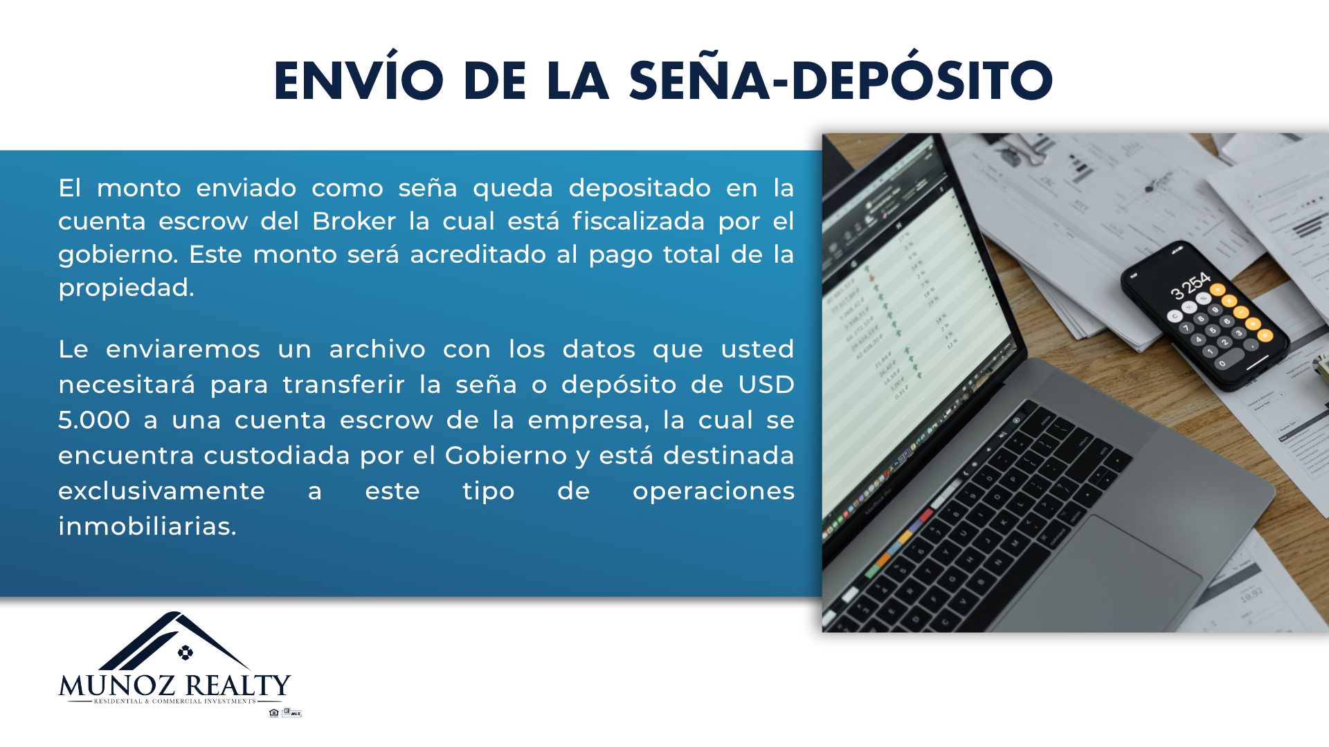 El monto enviado como seña queda depositado en la cuenta escrow del Broker la cual está fiscalizada por el gobierno. Este monto será acreditado al pago total de la propiedad.
