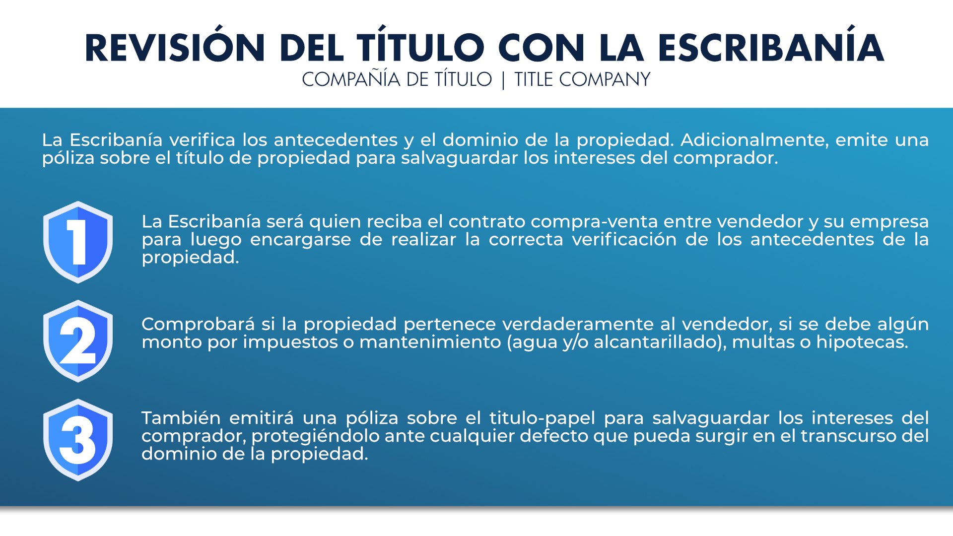 La Escribanía verifica los antecedentes y el dominio de la propiedad. Adicionalmente, emite una póliza sobre el título de propiedad para salvaguardar los intereses del comprador.
